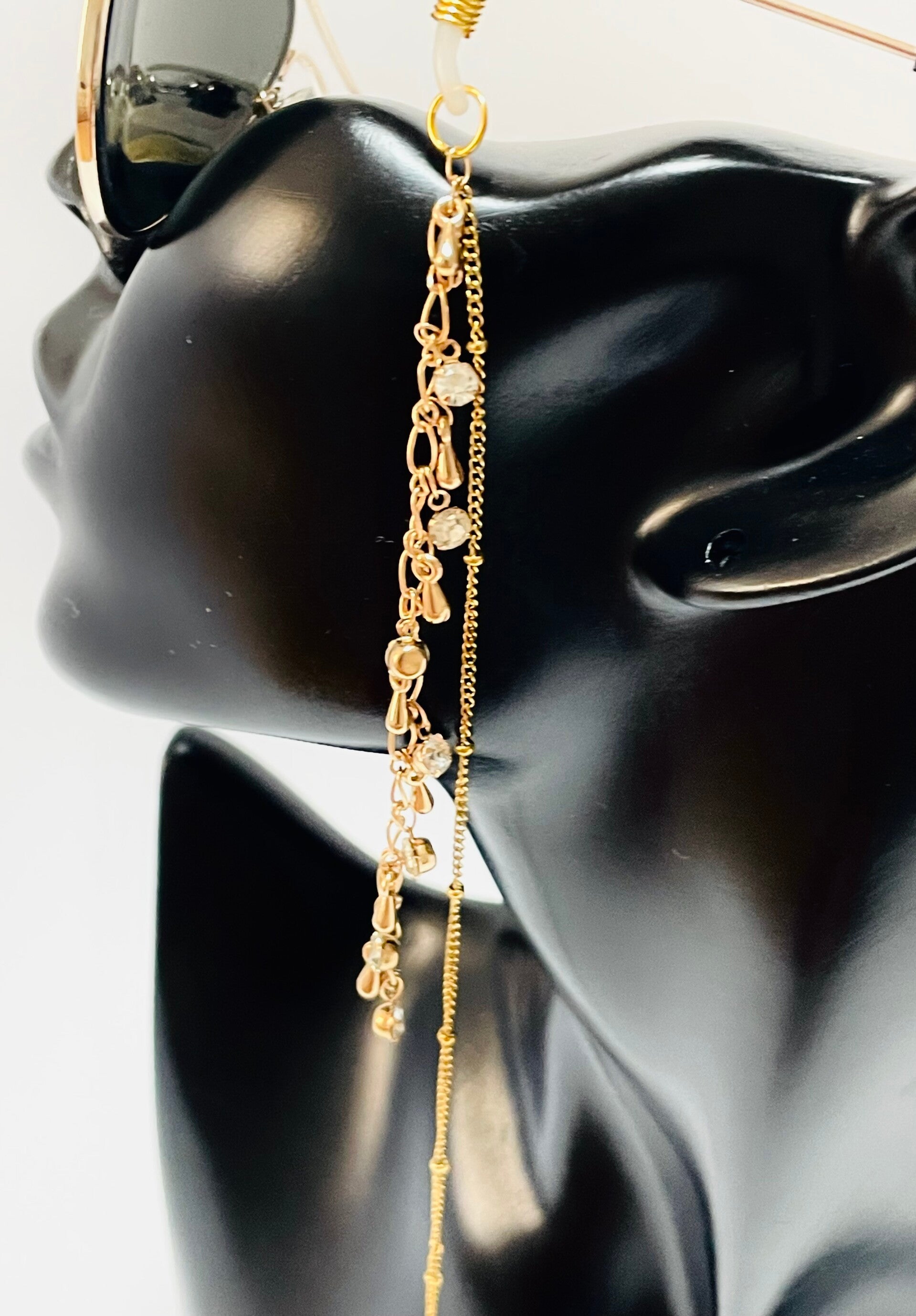Cet ensemble est composé d'une chaîne à lunettes dorée avec un pendant orné de diamants. Un étui à lunettes une pochette de rangement pour la chaîne et un chiffon pour nettoyer les verres font partie de cet ensemble